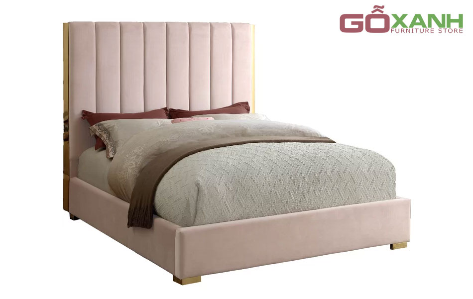 Chất liệu: Đầu giường có hai thanh Inox 304 mạ vàng Titan cao cấp, thân giường bọc nệm bằng vải nhập khẩu